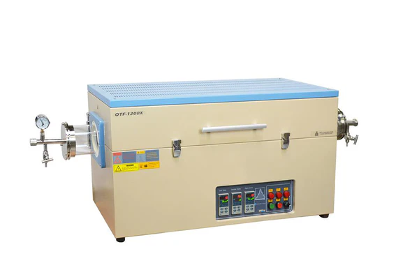 OTF-1200X-III-UL series are long, and split-able three-zone tube furnaces with tubes up to 127mm (5″) O.D. capable of quickly heating up to 1200°C. The multiple zones also enable the user to create different thermal gradients by varying the temperature of the three zones. The furnace includes one fused quartz tube, one pair of vacuum sealing flanges with a pressure gauge & a ball valve for immediate use. Three 30-segment temperature controllers are installed with a K-type thermal couple. Microprocessor-based self-tuning PID control provides excellent temperature control without overshooting, along with an accuracy of +/- 1 °C. It is an excellent furnace for annealing, diffusing, and sintering samples under various gas atmospheres.